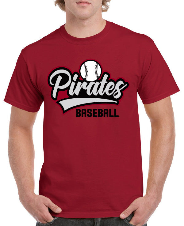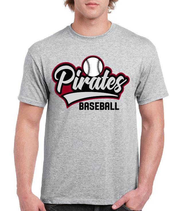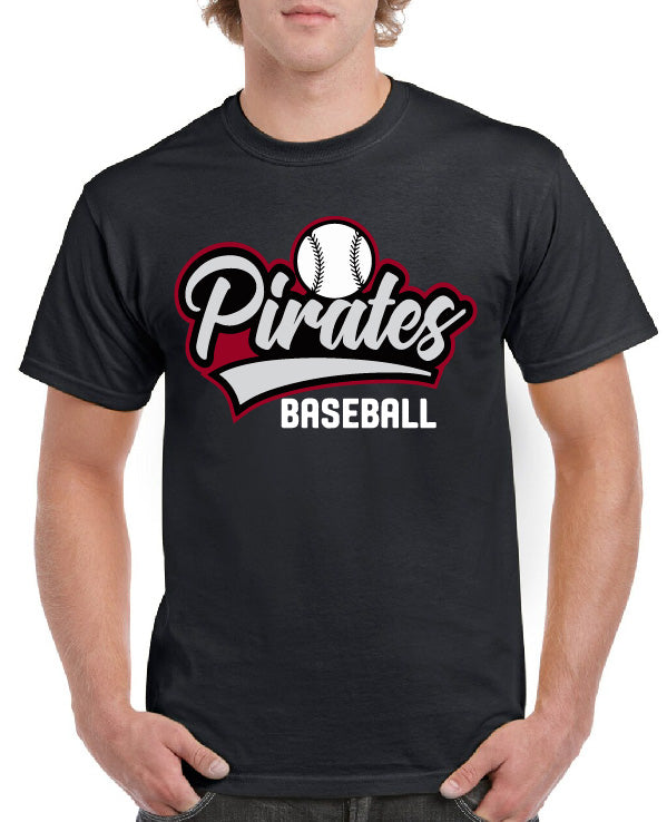 Cheer on your team and show off your school spirit with our Pirates Baseball A Tee, perfect for game day! We have you covered with direct-to-film. Let us help you represent your school in style! Call for pricing on any large quantity over 24 shirts.