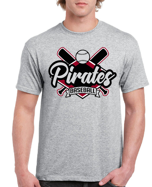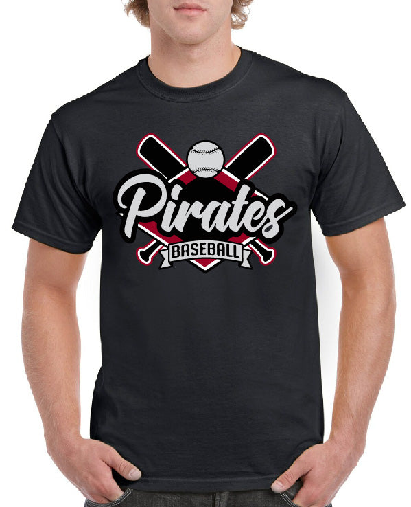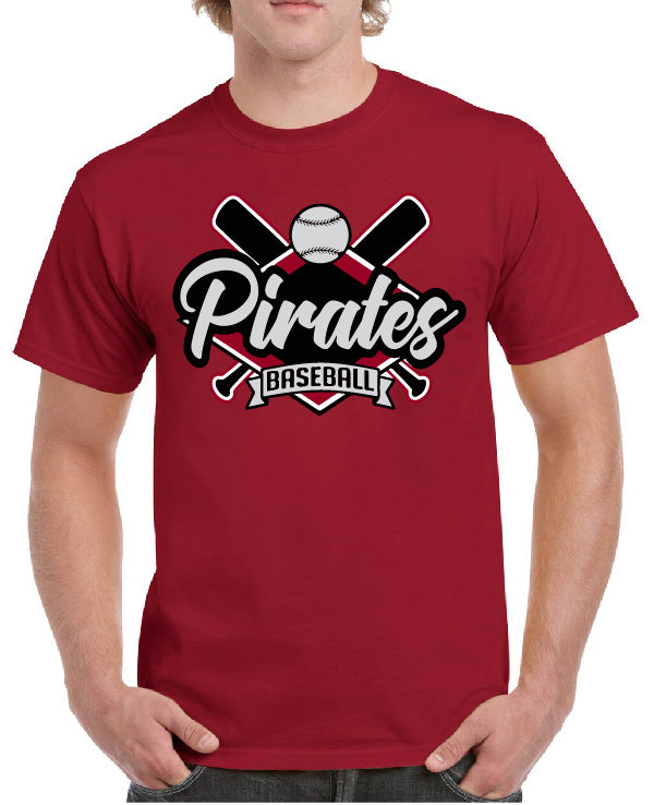 Cheer on your team and show off your school spirit with our Pirates Baseball Field Tee, perfect for game day! We have you covered with direct-to-film. Let us help you represent your school in style! Call for pricing on any large quantity over 24 shirts.