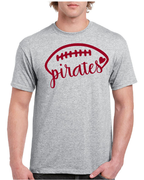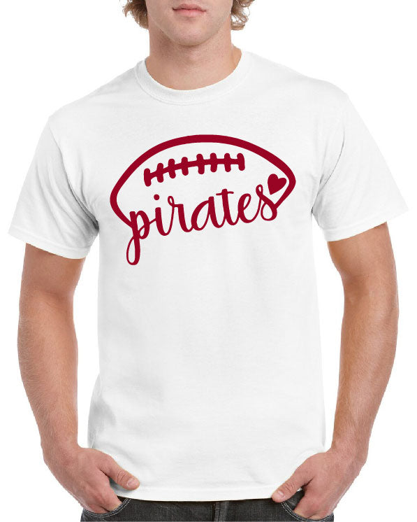 Prepare to unleash your inner pirate as you embrace the Football Pirates Tee and show off your school spirit! We have you covered with direct-to-film. Let us help you represent your school in style! Call for pricing on any large quantity over 24 shirts.